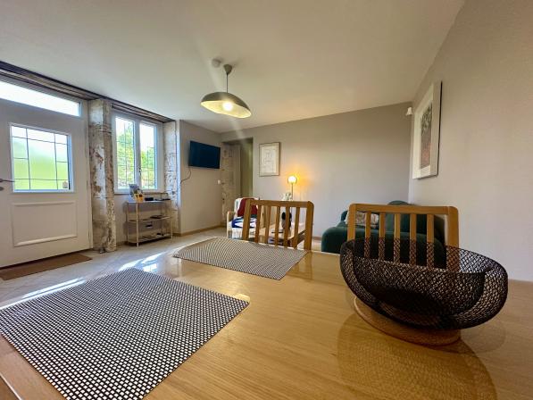 Le gîte, de plain pied (1 seule marche pour accéder à la chambre) dispose d’une pièce de vie agréable, avec un espace salon équipé d’un écran plat, et une cuisine entièrement aménagée.